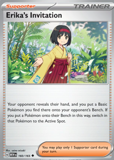 Add strategic support to your Pokémon TCG collection with Erika’s Invitation (#160/165) from the Pokémon TCG: Scarlet & Violet 151 expansion — an Uncommon Supporter Trainer card that lets your opponent reveal their hand, then you choose a Basic Pokémon from it to put onto their Bench, and if you do, that Pokémon switches into the Active Spot 🎴👀 .